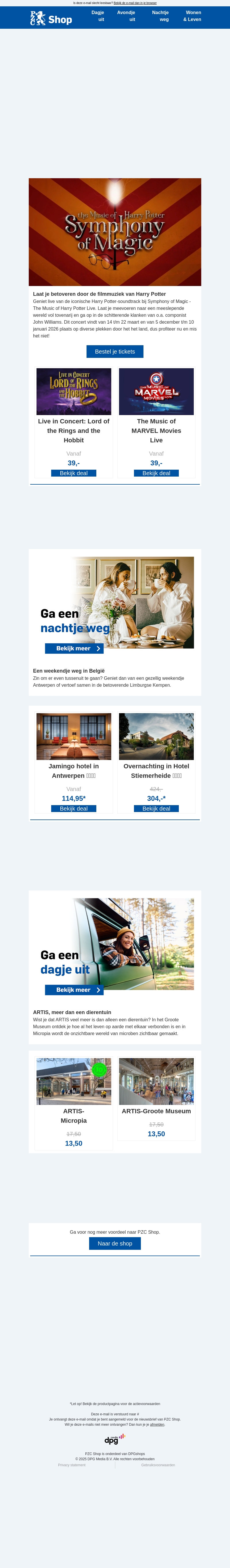 Ontdek de betoverende filmmuziek van Harry Potter in de Symphony of Magic. Beleef ook live concerten van Lord of the Rings en MARVEL Movies. Geniet van een weekendje weg in België of een dagje uit naar ARTIS. Boek nu je tickets en ervaar een wereld vol muziek en avontuur.