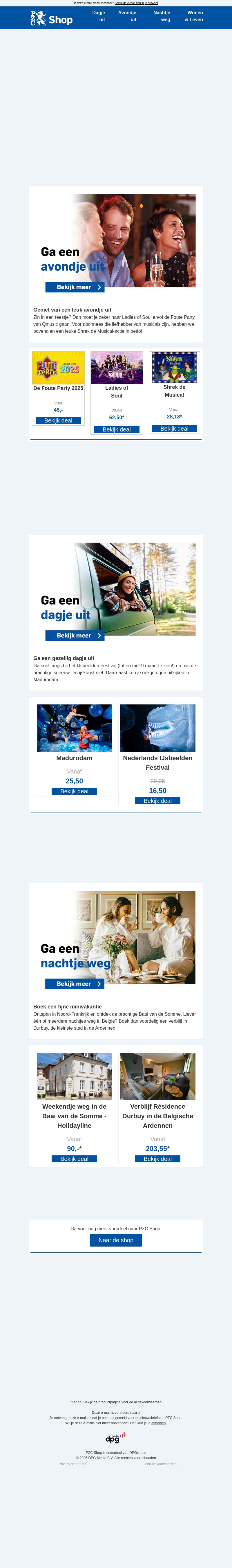 Maak je klaar voor onvergetelijke feestelijke avondjes uit met speciale kortingen. Van boeiende theatervoorstellingen tot spannende dagtrips en ontspannen overnachtingen, er is voor ieder wat wils. Verken onze exclusieve aanbiedingen en maak van jouw uitje een onvergetelijke ervaring.