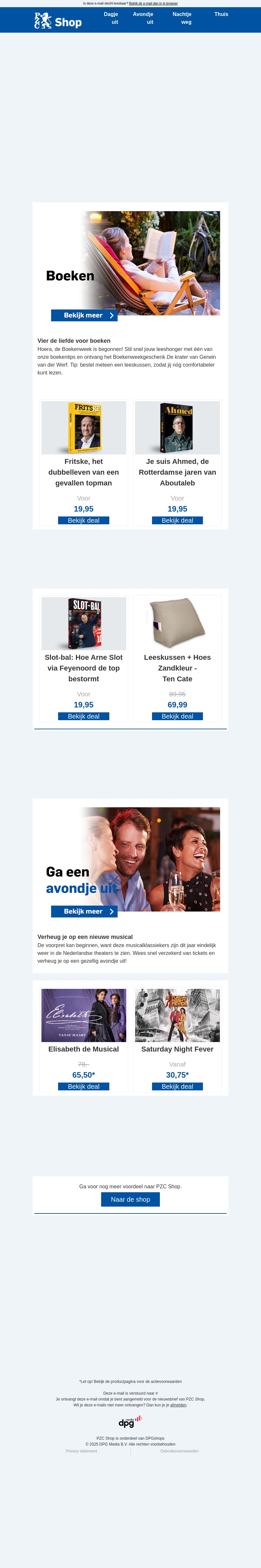 De Boekenweek is begonnen! Beleef de magie van boeken en ontvang het Boekenweekgeschenk gratis bij je aankoop. Verken onze aanbiedingen en ontdek de nieuwste titels. Daarnaast is er een breed aanbod van musicals en accessoires om je leeservaring compleet te maken. Mis deze kans niet om je boekenplank aan te vullen en te genieten van culturele avonden.