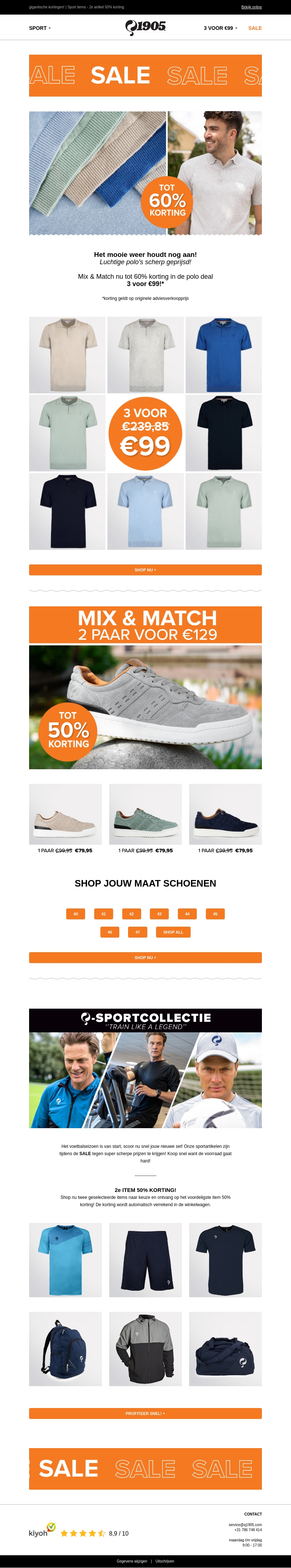 Profiteer van onze geweldige POLO SALE met kortingen tot wel 60%! Mix en match 3 luxe polo's voor slechts €99. Daarnaast bieden we schoenen en sportcollectie items aan met korting. Sla nu je slag en vernieuw je garderobe voordelig!