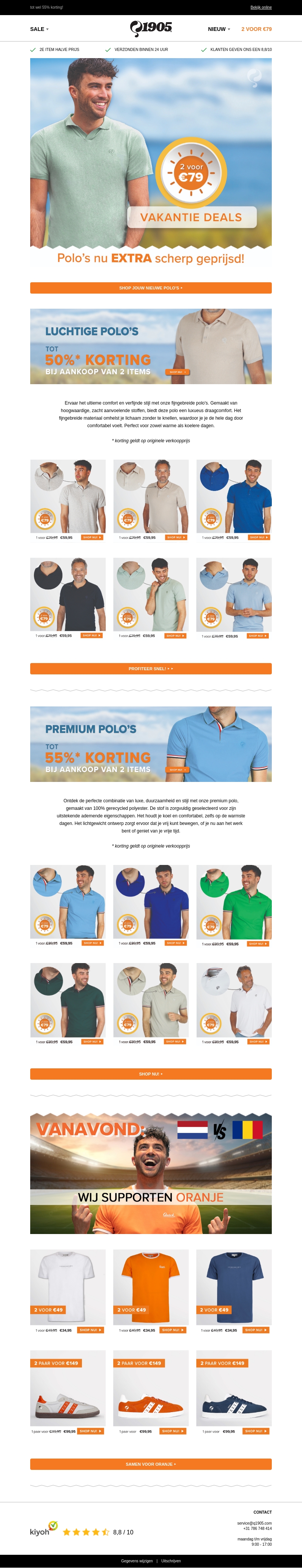 Profiteer nu van onze exclusieve vakantie deals! Koop 2 comfortabele en stijlvolle polo's voor maar €79. Daarnaast hebben we koele en premium polo's met flinke kortingen. Steun Oranje met onze sportieve kleding- en schoenenselectie. Zorg ervoor dat je deze kans niet mist!