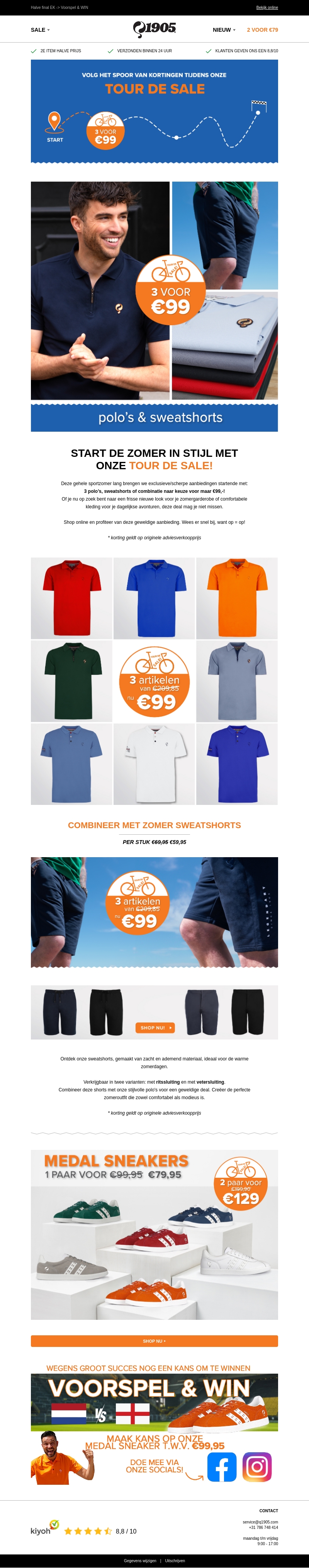 De 'Tour de Sale' brengt exclusieve zomerse aanbiedingen. Koop nu drie polo's of sweatshorts voor slechts β¬99. Ontdek comfortabele en stijlvolle kleding in verschillende kleuren. Wees er snel bij en profiteer van deze aanbiedingen. Perfect voor de warme zomerdagen. Combineer nu en bespaar!