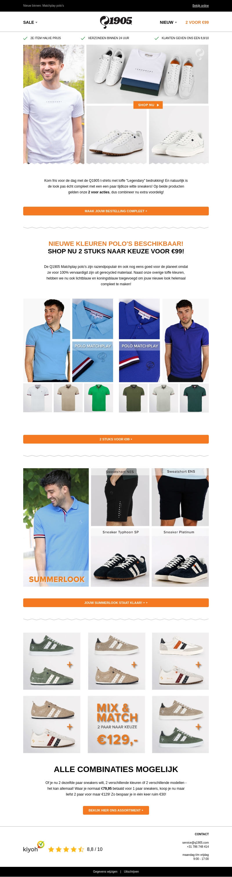 Blijf stijlvol deze zomer met Q1905! Ontdek onze nieuwste collectie t-shirts en polo's met coole prints en kleuren. Shop nu twee polo's voor slechts €99 en profiteer van onze Mix & Match sneakeractie. Beleef de zomer in stijl en comfort met Q1905 mode.