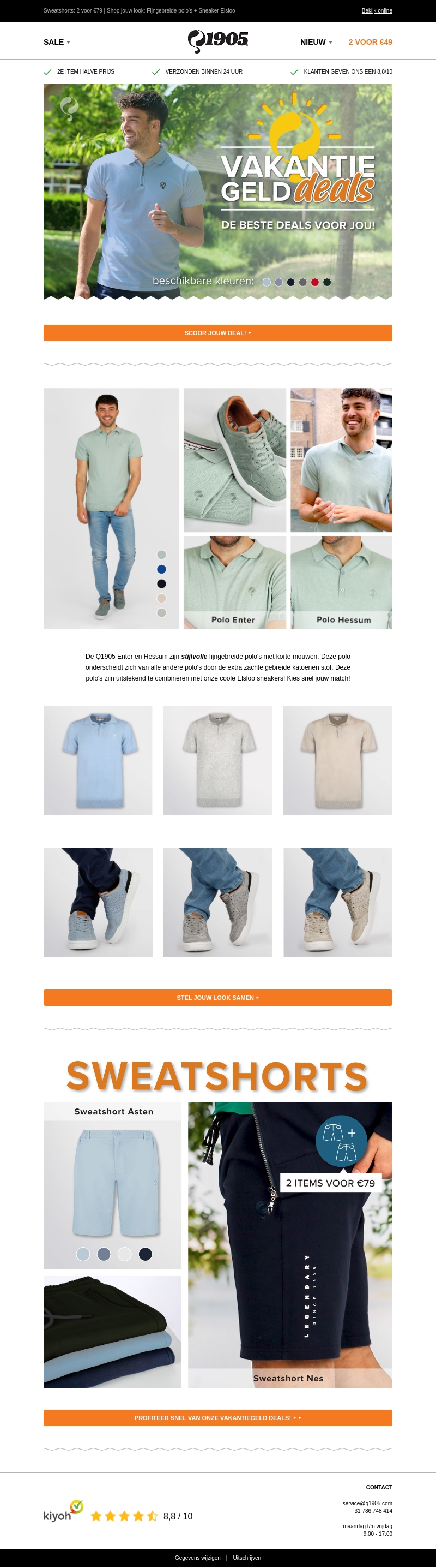 Profiteer van onze unieke vakantiegeld deals op stijlvolle poloshirts en comfortabele sweatshorts. Onze poloshirts worden gekenmerkt door hun fijne breisel en zachte katoen. Combineer ze perfect met onze Essloo sneakers. Bekijk ook onze sweatshorts acties en stel je ideale zomerse look samen.