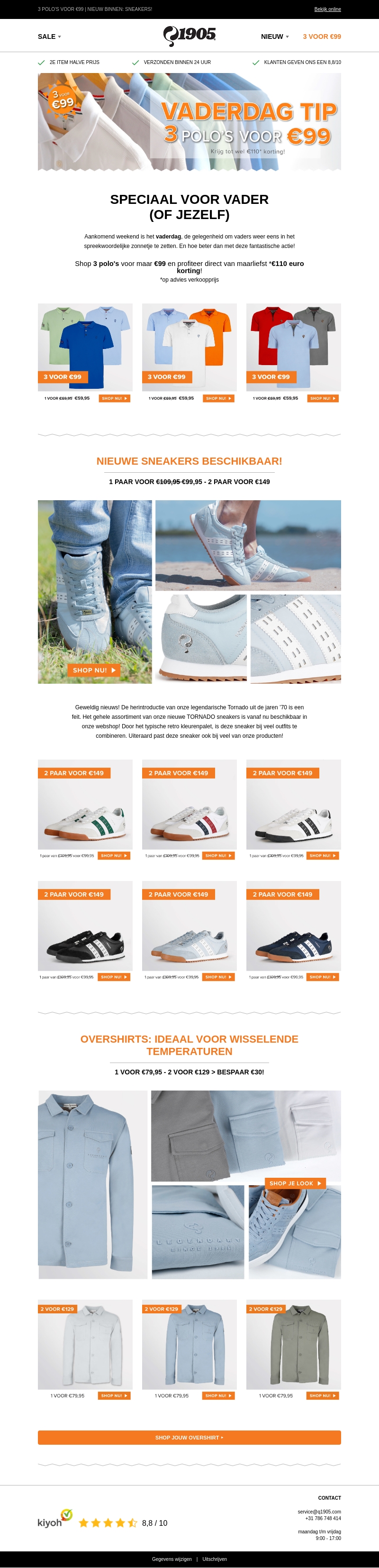 Zet je vader in het zonnetje met onze exclusieve aanbiedingen! Voor Vaderdag bieden wij een pakket van 3 polo's aan voor slechts €99. Profiteer van de beste kwaliteit en stijl om je vader te verrassen. Bekijk ook onze nieuwe sneakercollectie en praktische overshirts!