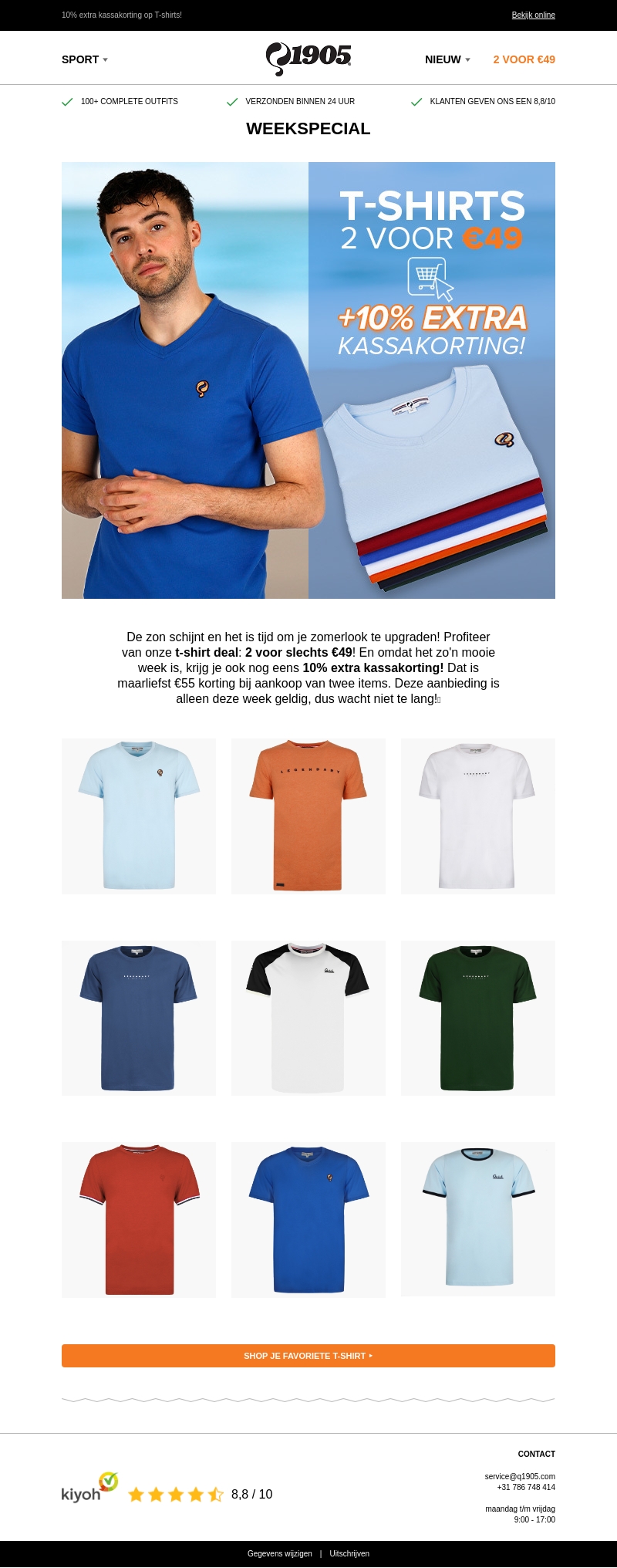 De zon schijnt en het is tijd om je zomerlook te upgraden! Profiteer van onze t-shirt deal: 2 voor slechts €49! En omdat het zo’n mooie week is, krijg je ook nog eens 10% extra kassakorting. Deze aanbieding is alleen deze week geldig, dus wacht niet te lang! Bezoek onze website en shop je favoriete t-shirts.