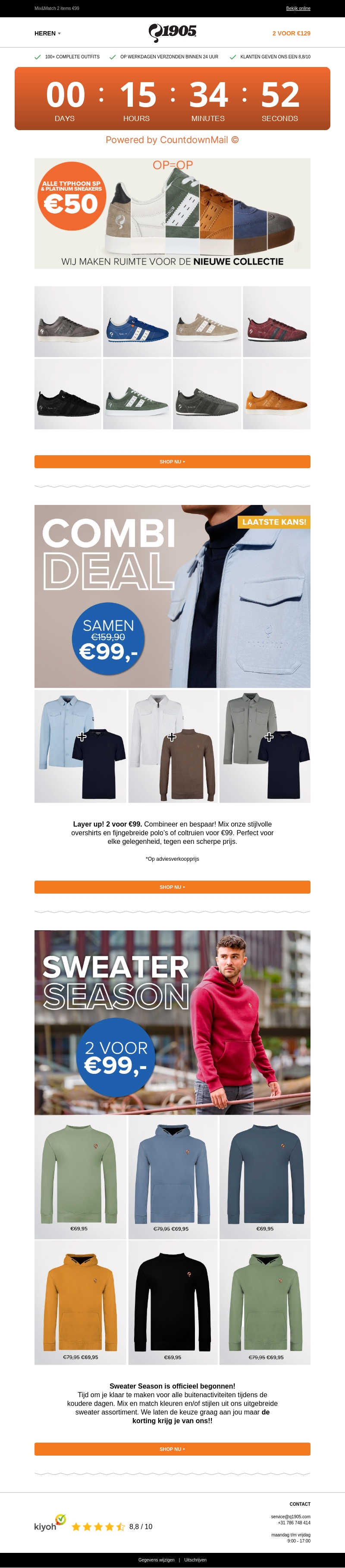 Grijp de laatste kans om sneakers voor €50 te scoren! Profiteer ook van onze Combi Deal met overshirts voor €99. Mis de Sweater Season-aanbiedingen niet met truien voor elke stijl en gelegenheid.