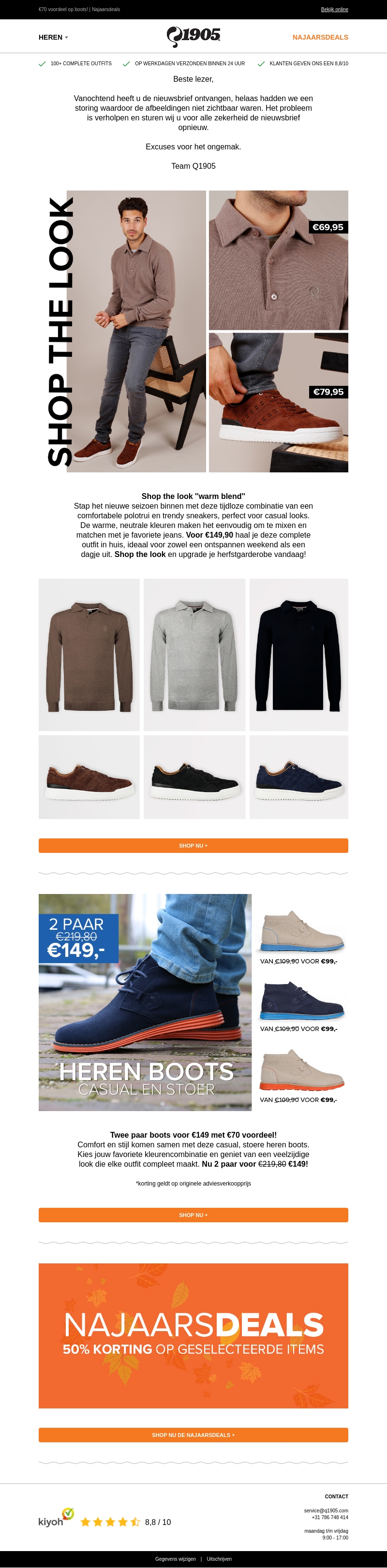 Welkom bij de CORRECTE VERSIE van onze nieuwsbrief! We hebben de beste najaarslooks voor je samengesteld. Van stijlvolle truien tot trendy sneakers, er is voor ieder wat wils. Bovendien profiteer je van geweldige najaarsdeals met tot 50% korting op geselecteerde items. Shop je herfstcollectie vandaag nog!