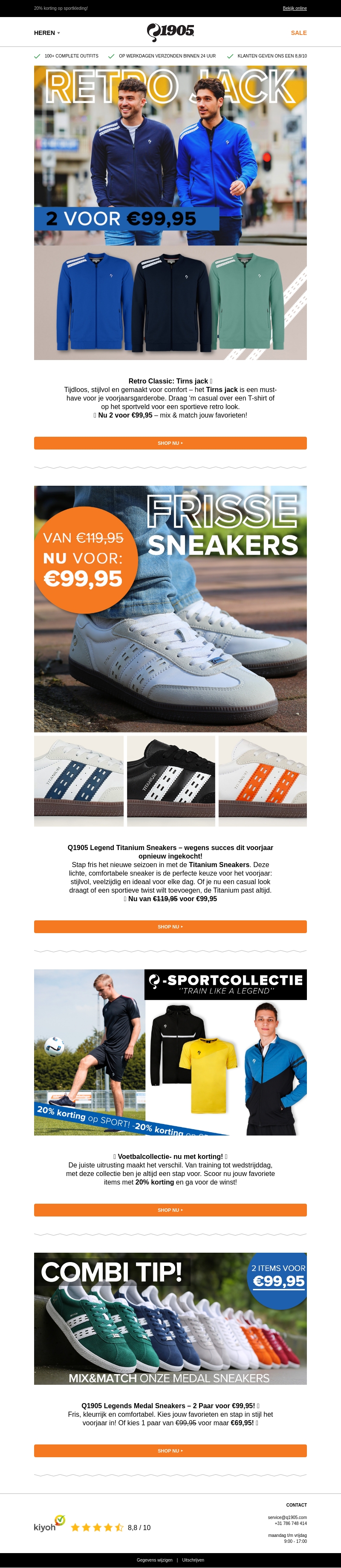 Ontdek onze Retro Classic jacks, de perfecte aanvulling op je voorjaarsgarderobe, nu 2 voor €99,95! Mix en match jouw favoriete kleuren en stijlen. Daarnaast hebben we frisse sneakers voor slechts €99,95. Mis onze sportcollectie niet met een korting van 20%.