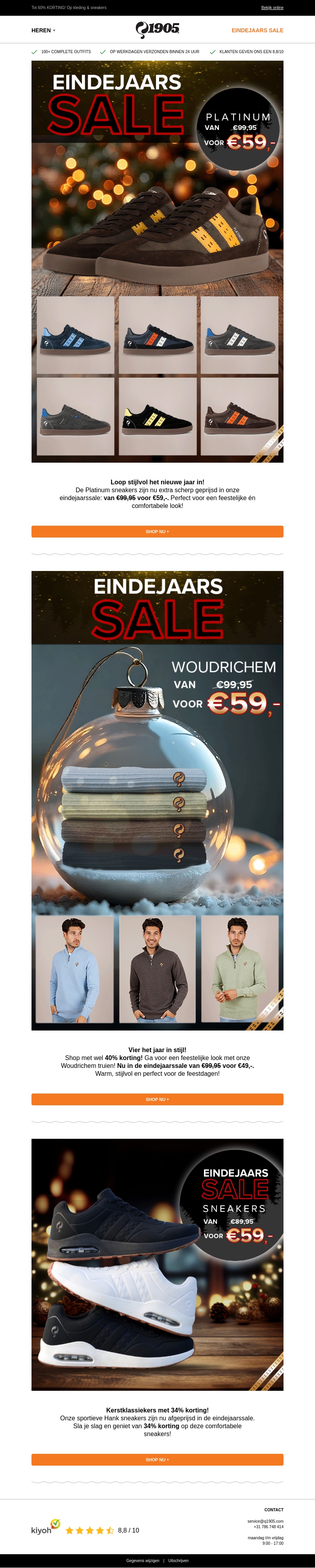 Beleef het nieuwe jaar stijlvol met onze speciale eindejaars SALE. Ontdek de scherp geprijsde Platinum sneakers voor slechts β¬59,- en geniet van flinke kortingen op onze Woudrichem truien. Mis ook de kans niet om sportieve Hank sneakers te scoren met 34% korting.