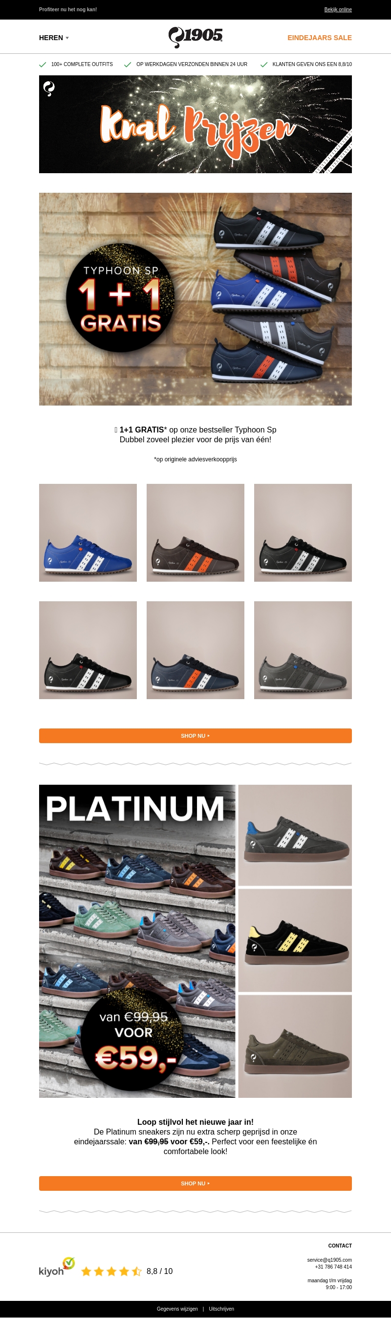 De laatste 24 uur van onze eindejaarssale zijn aangebroken! Profiteer van de unieke 1+1 gratis aanbieding op onze populaire Typhoon Sp sneaker. Bovendien zijn de Platinum sneakers nu extra scherp geprijsd van €99,95 voor slechts €59,-. Ideaal voor een stijlvolle en comfortabele start van het nieuwe jaar. Mis deze kans niet en shop nu de beste deals!