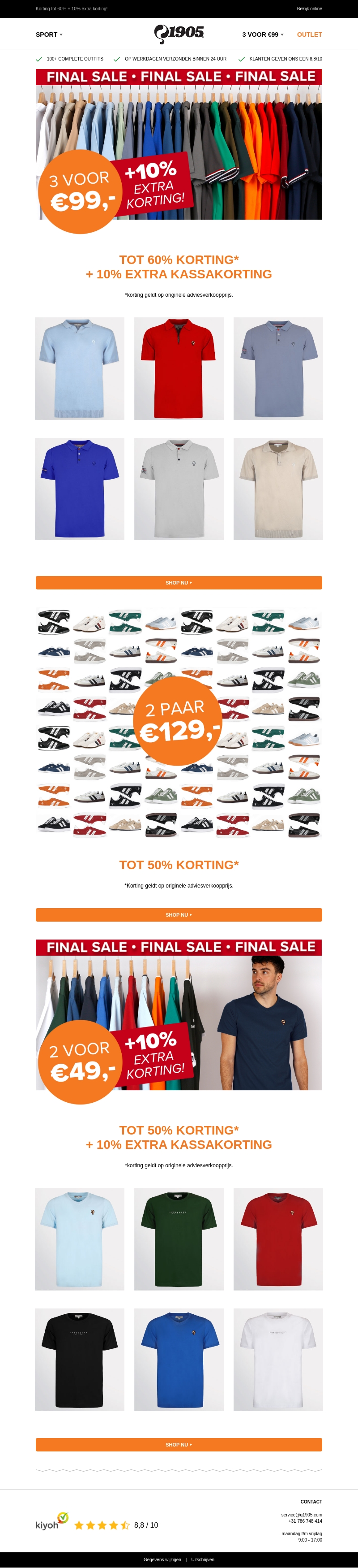 Mis het niet! Het is de finale uitverkoop met kortingen tot wel 60% op diverse items. Daarnaast ontvangt u een extra 10% korting aan de kassa. Shop nu uw favoriete outfits, van polo's tot sneakers, en bespaar groot.