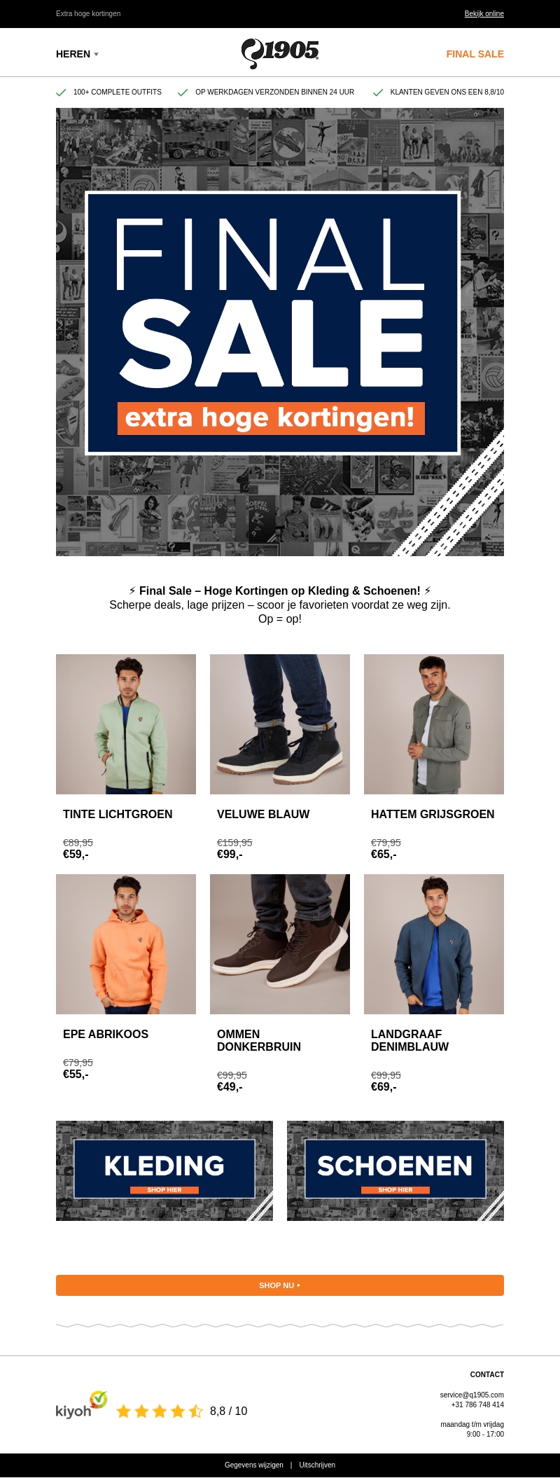 Mis de kans niet om je favoriete kleding en schoenen met hoge kortingen te scoren in onze Final Sale. Van stijlvolle jassen tot trendy schoenen, onze collectie heeft alles wat je nodig hebt. Wacht niet te lang want op = op. Shop direct online en geniet van snelle verzending binnen 24 uur.