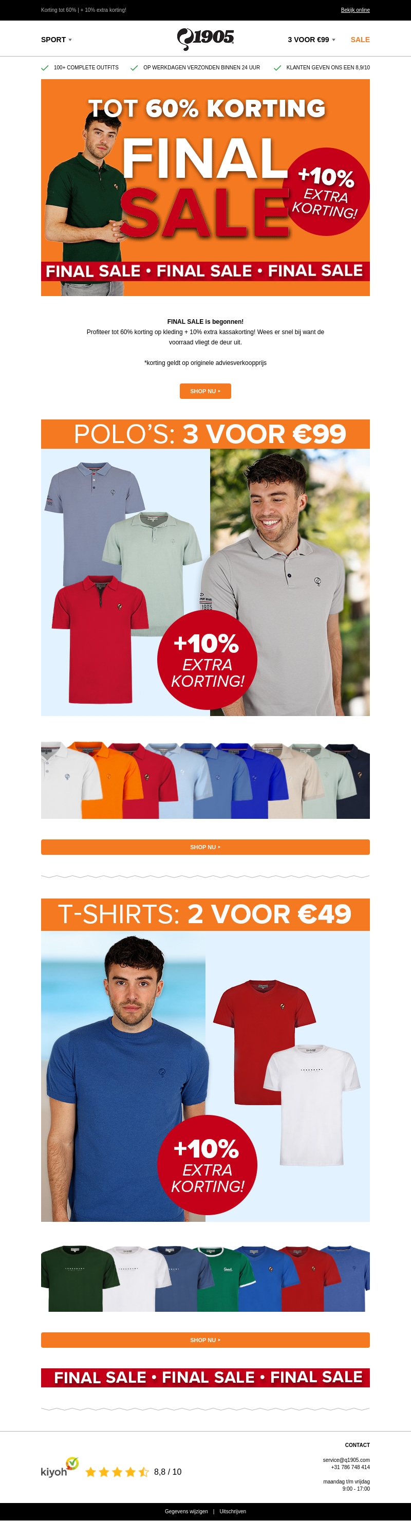De Final Sale is vandaag begonnen met kortingen tot wel 60% op kleding. Daarnaast ontvang je 10% extra kassakorting. Koop nu polo's 3 voor €99 en T-shirts 2 voor €49. Wees er snel bij, want op = op!