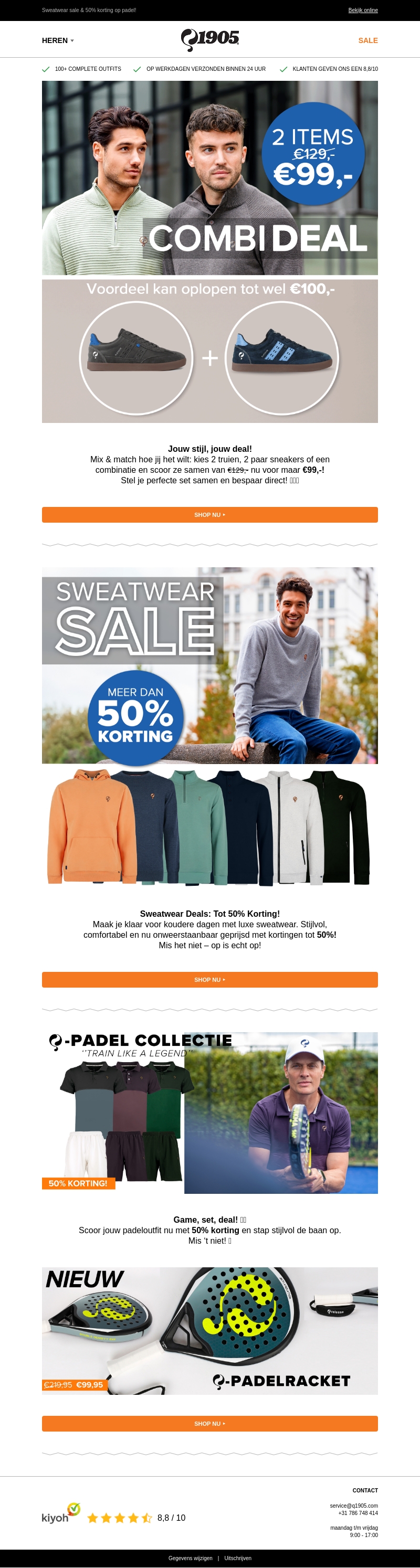 Profiteer van grote kortingen met onze CombiDeal: koop twee items voor slechts €99,-. Ontdek sweatwear met kortingen tot 50% en stap in stijl de padelbaan op met onze nieuwe collectie. Mis de kans niet om jouw perfecte set samen te stellen en direct te besparen. Bezoek onze webwinkel voor meer topdeals.