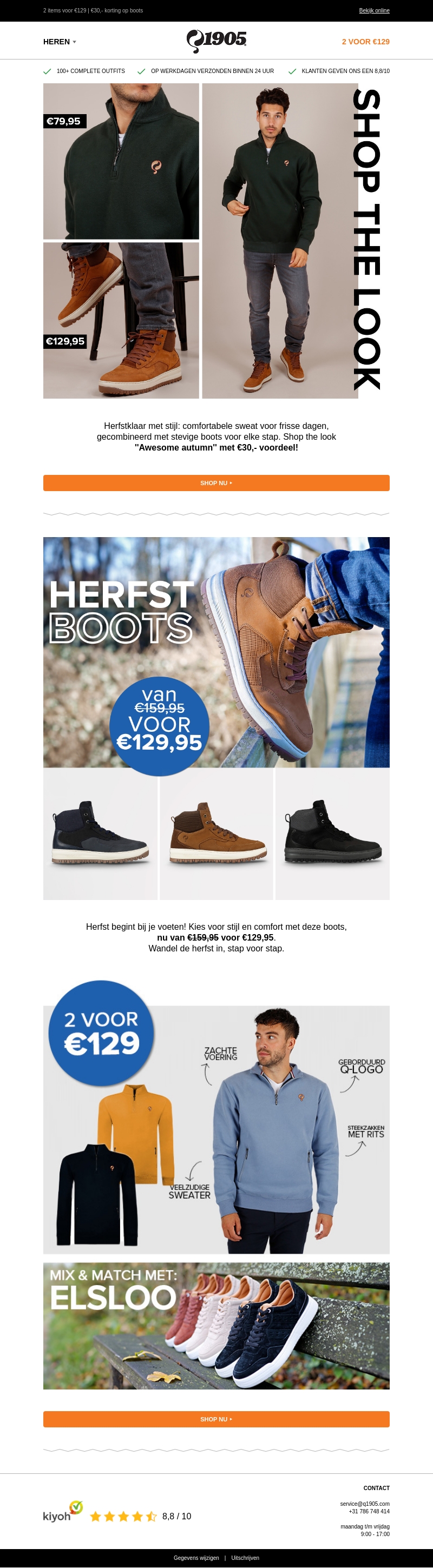 Bereid je voor op de herfst met stijlvolle en comfortabele kleding van 1905. Geniet van herfstboten in de aanbieding en veelzijdige sweaters voor elke gelegenheid. Ontdek ook de speciale korting van €30 op de 'Awesome autumn' look.