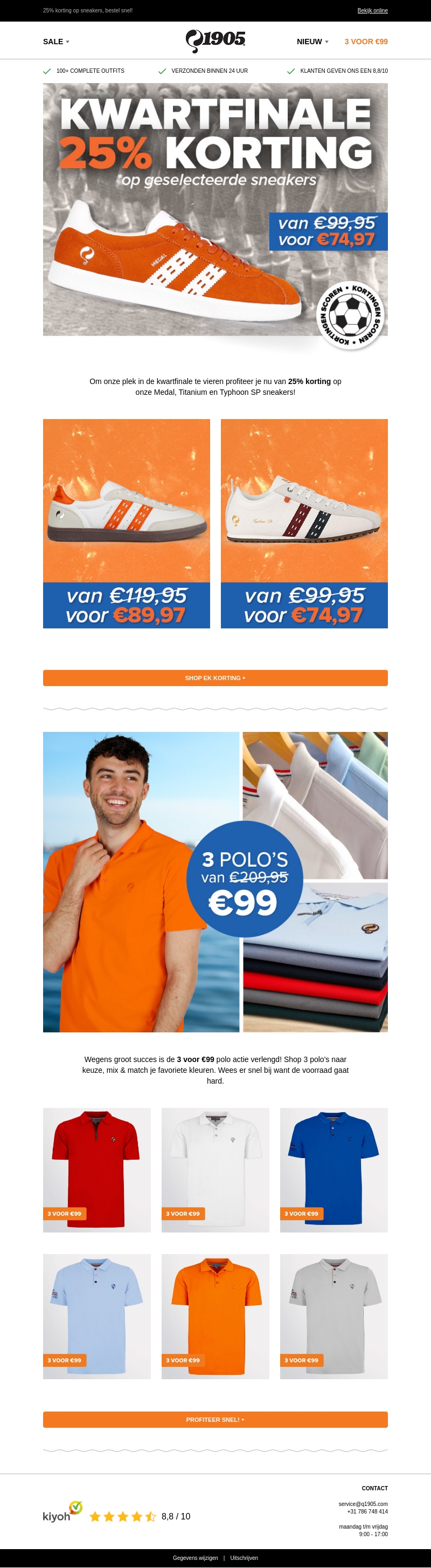 Vier de kwartfinale met 25% korting op geselecteerde sneakers! Ontdek ons uitgebreide assortiment en profiteer van geweldige deals op Meda, Stadium en Typhoon SP sneakers. Daarnaast hebben we onze 3 voor €99 polo actie verlengd. Mis het niet en shop nu!