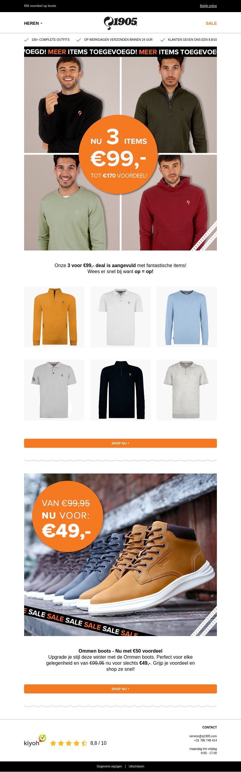 Profiteer van de nieuwste aanbiedingen bij 1905. Voeg meer items toe aan je collectie met de 3 voor €99 deal. Bovendien zijn de stijlvolle Ommen boots nu verkrijgbaar voor slechts €49. Wacht niet te lang, want op=op!