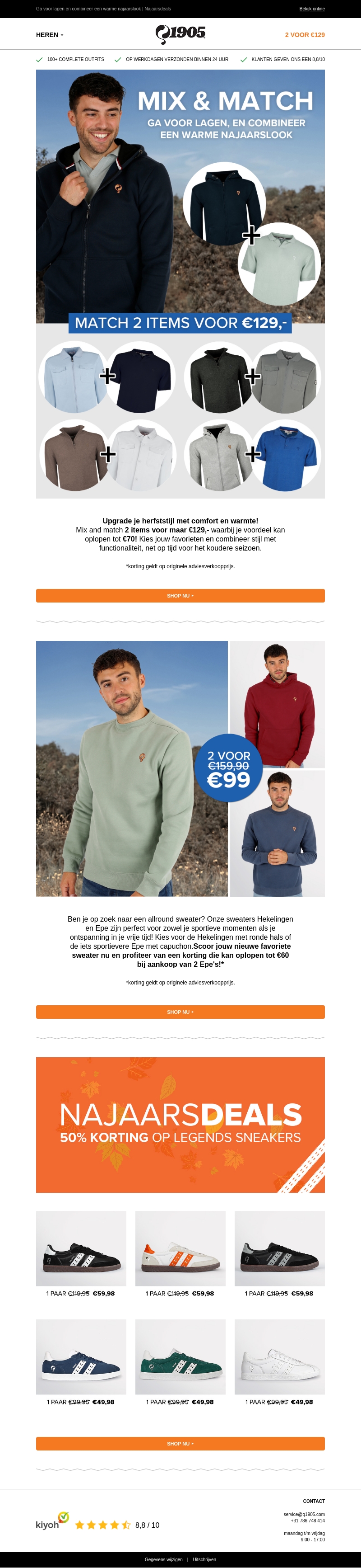 Upgrade je herfstgarderobe met onze Mix & Match actie: 2 items voor maar €129. Kies uit een breed assortiment van stijlen en combineer comfort met mode voor het koude seizoen. Ideaal om lagen te creëren voor een warme look. Profiteer ook van najaarsdeals met 50% korting op sneakers.