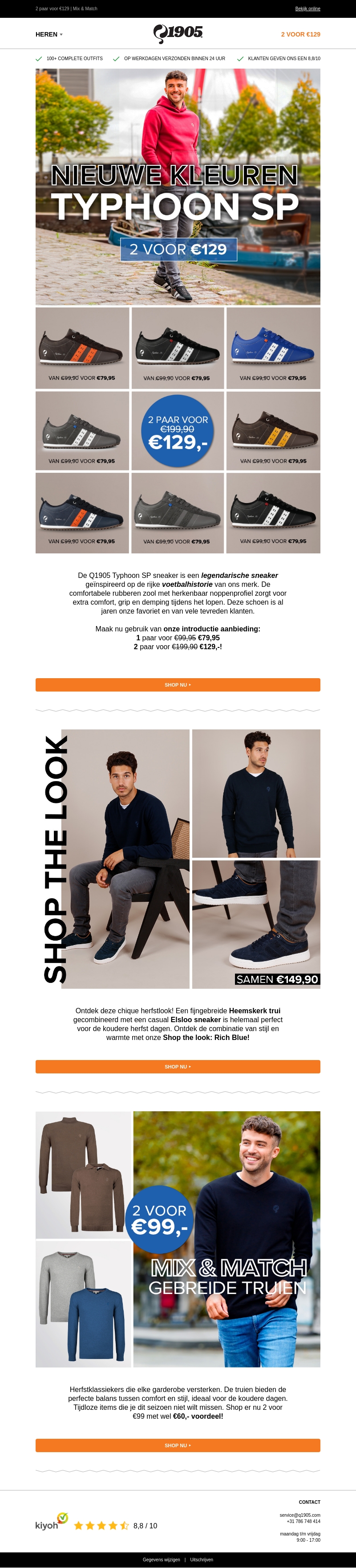 Bekijk de nieuwe kleuren van de legendarische Typhoon SP sneakers, nu verkrijgbaar in een 2-voor-€129 deal. Perfect voor sportliefhebbers, zorgen ze met hun comfortabele rubberen zool voor extra grip. Combineer met de stijlvolle Heemskerk trui voor een perfecte herfstoutfit. Nu ook mix & match gebreide truien in de aanbieding, 2 voor €99.