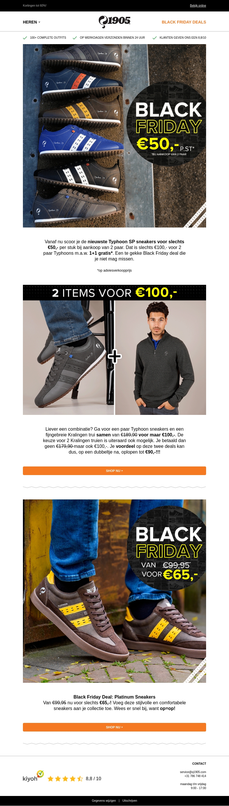 Black Friday is begonnen en 1905 heeft de beste deals voor jou! Scoor nu de Typhoon SP sneakers voor slechts €50 per paar bij aankoop van twee. Mix en match met een stijlvolle trui voor een complete look. Vergeet niet de Platinum sneakers voor slechts €65 toe te voegen aan je collectie. Mis deze unieke kansen niet!