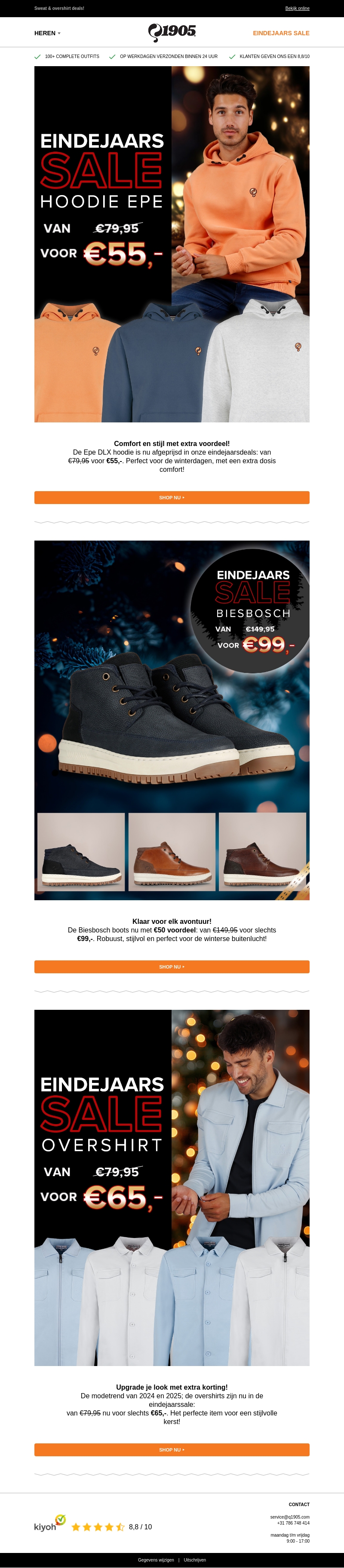 Profiteer van onze eindejaarsaanbieding met €50 korting op de Biesbosch boots. Perfect voor de winter, stijlvol en robuust. Daarnaast ook geweldige deals op hoodies en overshirts. Zorg ervoor dat je deze winter warm en in stijl de deur uit gaat. Wacht niet te lang, want op=op!