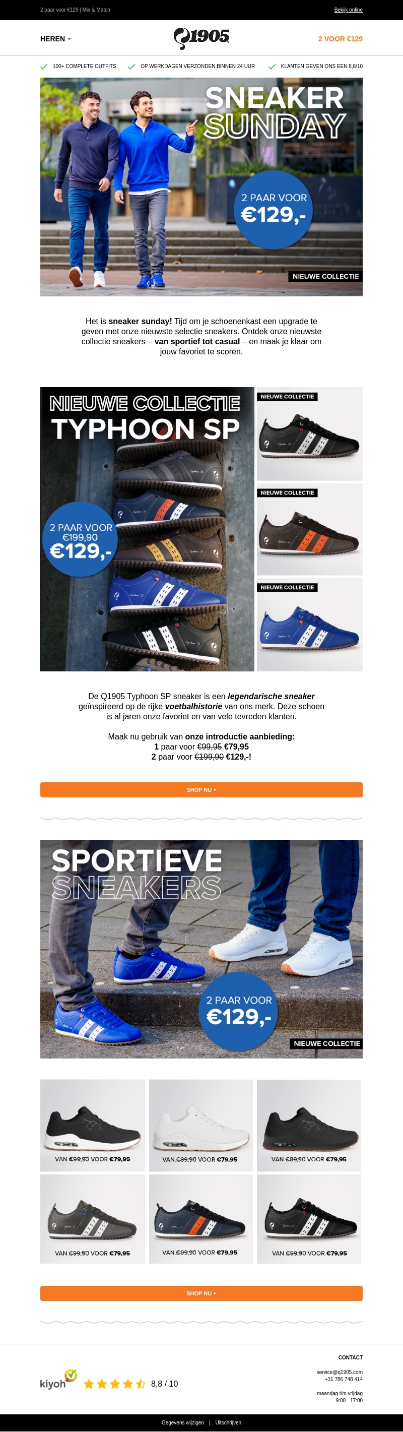 Het is Sneaker Sunday met Q1905! Geef je schoenenkast een upgrade met onze nieuwe collectie sneakers. Van sportief tot casual, je vindt het allemaal. Profiteer van de aanbieding: 2 paar voor slechts €129,-. Mis deze kans niet om je favorieten te scoren. Shop nu de nieuwste Typhoon SP sneakers.