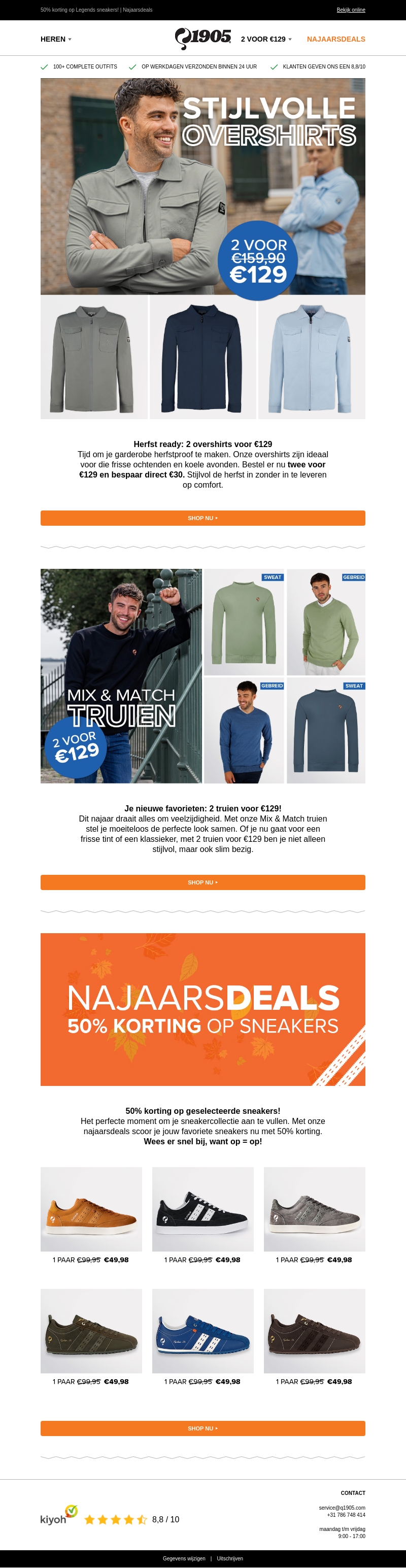 Stijlvolle overshirts in de aanbieding: 2 voor slechts €129. Deze veelzijdige kledingstukken zijn ideaal voor frisse herfstdagen. Profiteer nu van deze seizoensdeal en voeg comfort en stijl toe aan je garderobe. Ook verkrijgbaar: mix & match truien en 50% korting op sneakers.