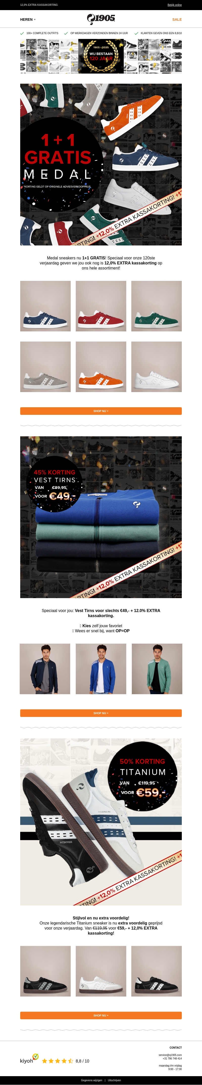 Profiteer van de feestelijke aanbiedingen bij Q1905 ter ere van hun 120ste verjaardag! Ontvang nu 1+1 gratis op geselecteerde Medal sneakers. Bovendien krijg je 45% korting op Vest Tirns en speciale prijzen op Titanium sneakers. Wacht niet langer en shop nu jouw favorieten met extra kassakorting! Ontdek de exclusieve deals en verwen jezelf met nieuwe mode-items.