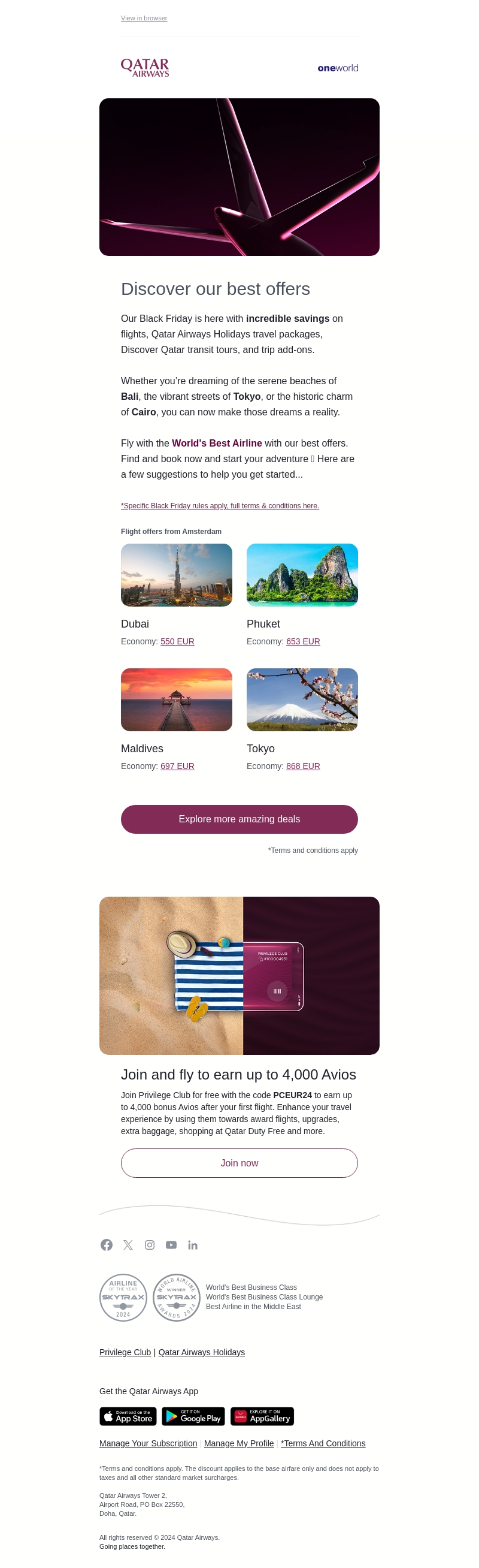 De Black Friday aanbiedingen van Qatar Airways zijn hier met indrukwekkende kortingen op vluchten, reispakketten en meer. Bezoek bestemmingen zoals Bali, Tokio of Caïro tegen gereduceerde prijzen. Boek nu je avontuur met de beste luchtvaartmaatschappij ter wereld. Vergeet niet je bonus Avios te verdienen met de code PCEUR24.