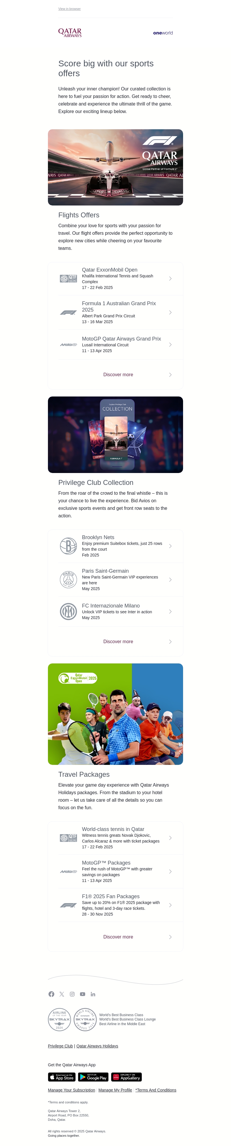 Qatar Airways nodigt je uit om je innerlijke kampioen te ontketenen met onze exclusieve sportaanbiedingen. Geniet van reizen naar wereldberoemde sportevenementen zoals de Qatar ExxonMobil Open en de MotoGP Qatar Airways Grand Prix. Profiteer van voordelige reisarrangementen en exclusieve lidmaatschapsvoordelen.