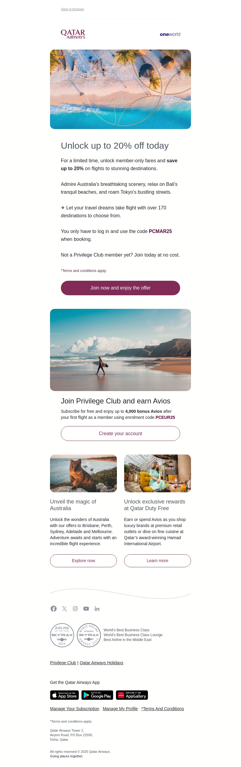 Ontgrendel tot 20% korting op vluchten naar prachtige bestemmingen met Qatar Airways. Of u nu Australië’s wonderen wilt verkennen of wil ontspannen op de stranden van Bali, nu is uw kans. Word lid van onze Privilege Club en gebruik de code PCMAR25 voor exclusieve voordelen. Deze aanbieding is slechts tijdelijk beschikbaar. Mis het niet en boek direct uw volgende avontuur!