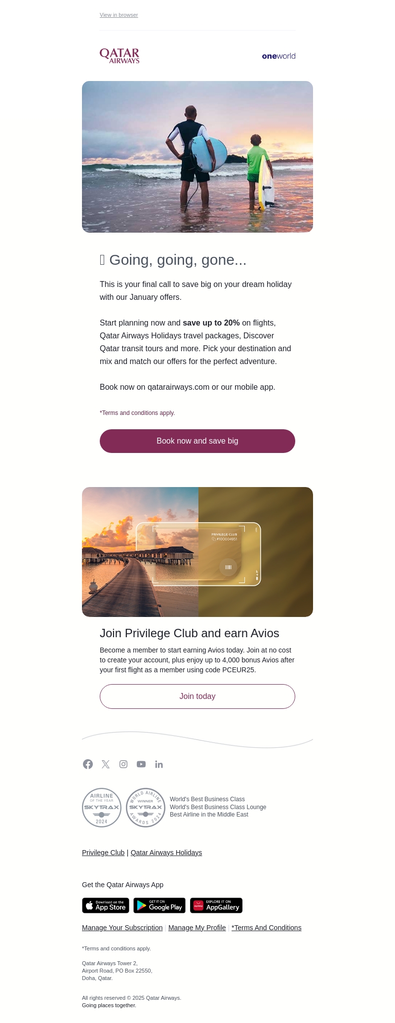 Mis deze kans niet om tot 20% te besparen op vluchten, vakantiereizen en meer met Qatar Airways. Boek snel uw droomvakantie nu de aanbiedingen nog geldig zijn. Word lid van de Privilege Club en verdien Avios, inclusief een bonus na uw eerste vlucht.