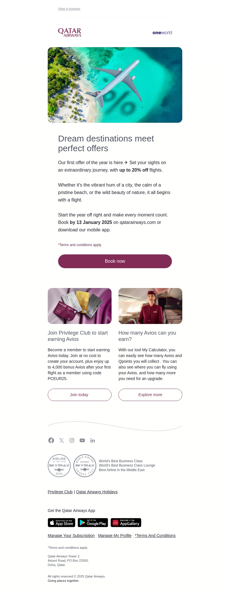 Qatar Airways biedt een fantastische start van het jaar met tot 20% korting op vluchten. Kies voor een ontspannende strandvakantie of een spannend stadsavontuur en bespaar. Boek vóór 13 januari 2025 om uw voordeel te halen en maak gebruik van de Privilege Club om extra Avios te verdienen.