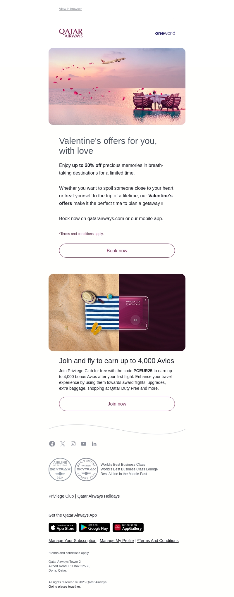 Vier de liefde met onze exclusieve Valentijnsdagaanbiedingen van Qatar Airways. Profiteer van kortingen tot 20% op adembenemende bestemmingen. Boek nu en maak onvergetelijke herinneringen met uw dierbaren. Lid worden van de Privilege Club levert ook bonus Avios op.