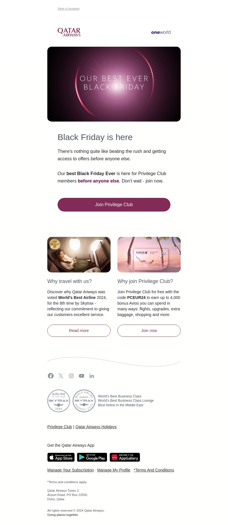 Qatar Airways presenteert hun beste Black Friday ooit met exclusieve aanbiedingen voor Privilege Club-leden. Meld je vandaag nog aan om als eerste toegang te krijgen tot deze spectaculaire deals. Ontvang tot 4.000 bonus Avios met de code PCEUR24. Mis deze kans niet om te profiteren van uitstekende kortingen op vluchten, upgrades en meer.