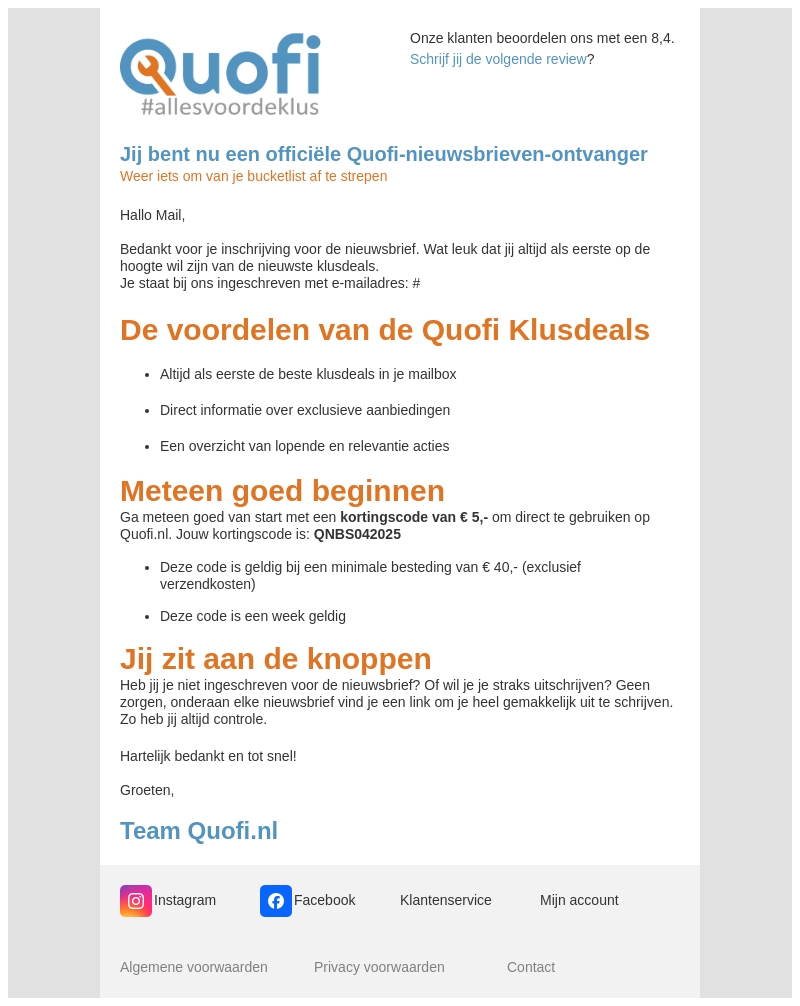 je bent aangemeld voor de quofi nieuwsbrief 5 korting dped89ha