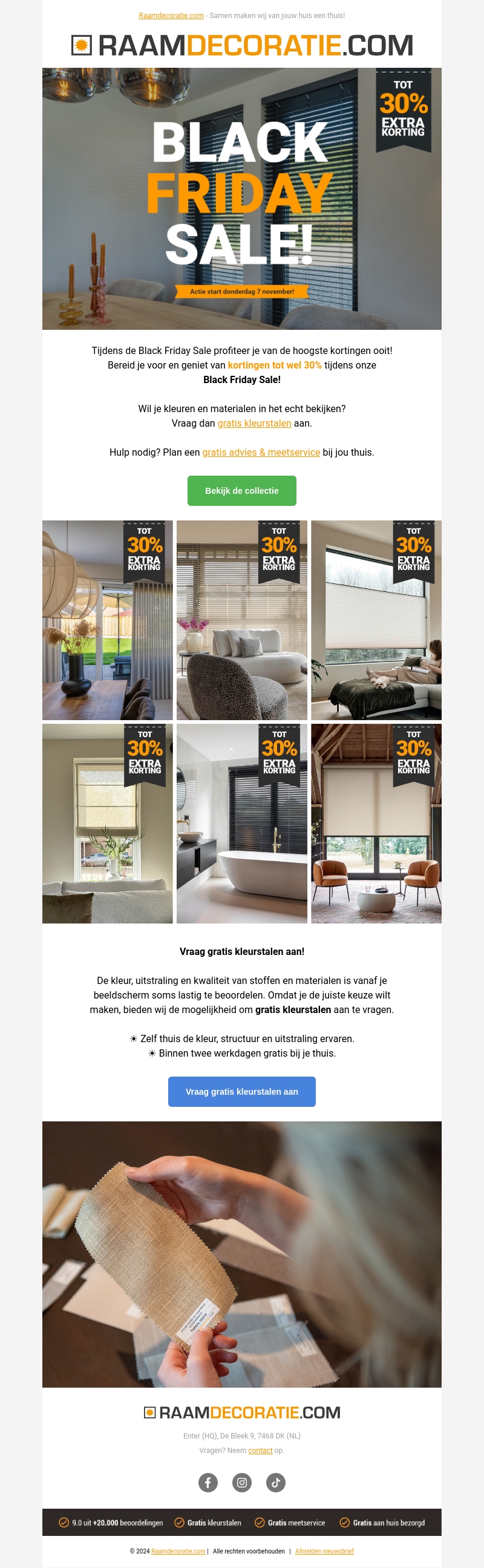 Tijdens de Black Friday Sale bij Raamdecoratie.com geniet je van exclusieve kortingen tot wel 30%! Ontdek een uitgebreid assortiment aan raamdecoratie en vraag gratis kleurstalen aan om thuis de perfecte keuze te maken. Onze adviesen meetservice staan klaar om je te helpen. Wees voorbereid en profiteer van deze ongekende deals.