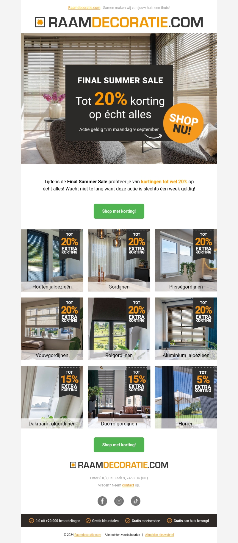 Profiteer nu van kortingen tot wel 20% op alle producten tijdens de Final Summer Sale bij Raamdecoratie.com. Deze exclusieve actie is geldig tot en met maandag 9 september. Mis deze kans niet en shop jouw favoriete raamdecoraties met extra korting. Bekijk ons uitgebreide assortiment en maak van jouw huis een thuis.