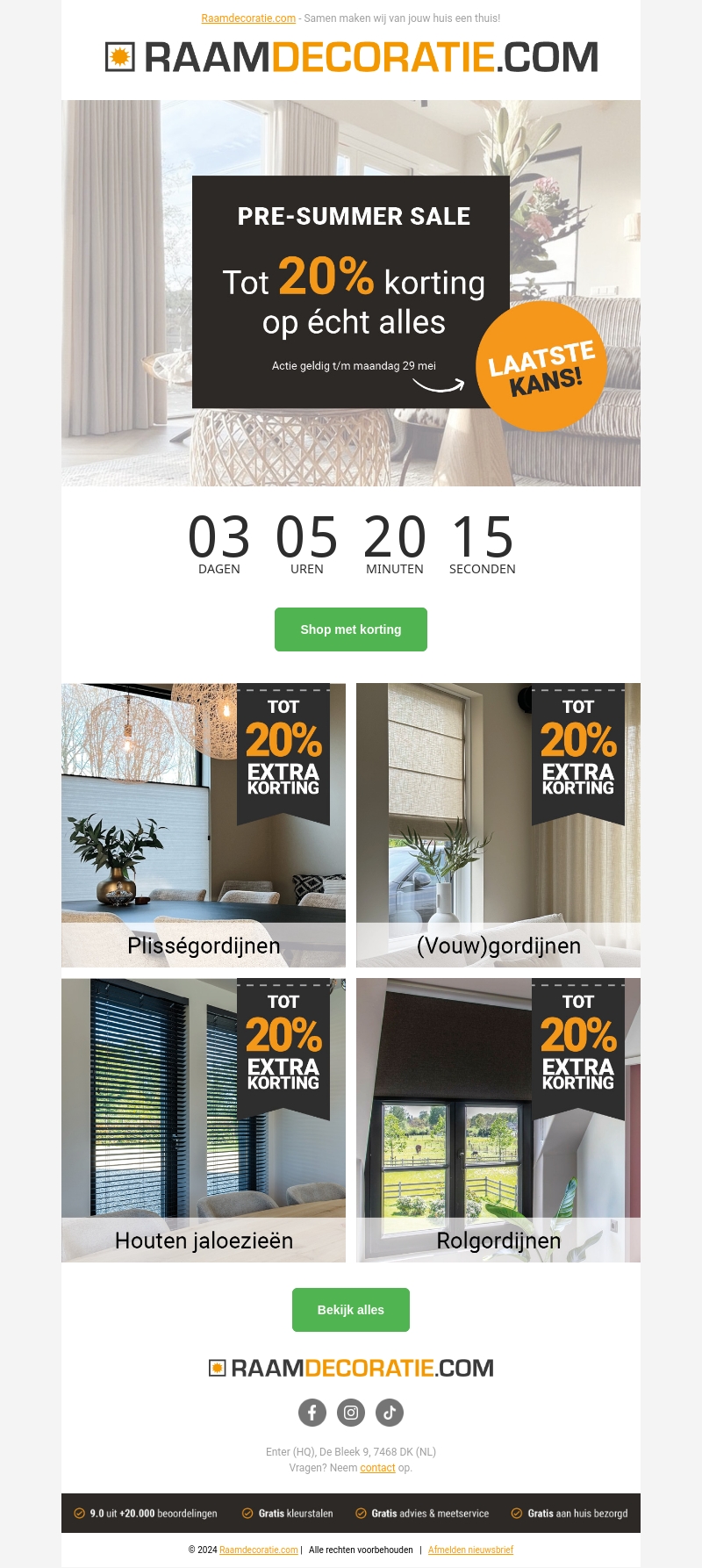 Mis de laatste kans niet om tot 20% korting te krijgen op alle raamdecoraties tijdens de Pre-Zomer Sale bij Raamdecoratie. Actie geldig t/m maandag 29 mei. Koop nu en transformeer je huis met stijlvolle gordijnen, jaloezieën en rolgordijnen.