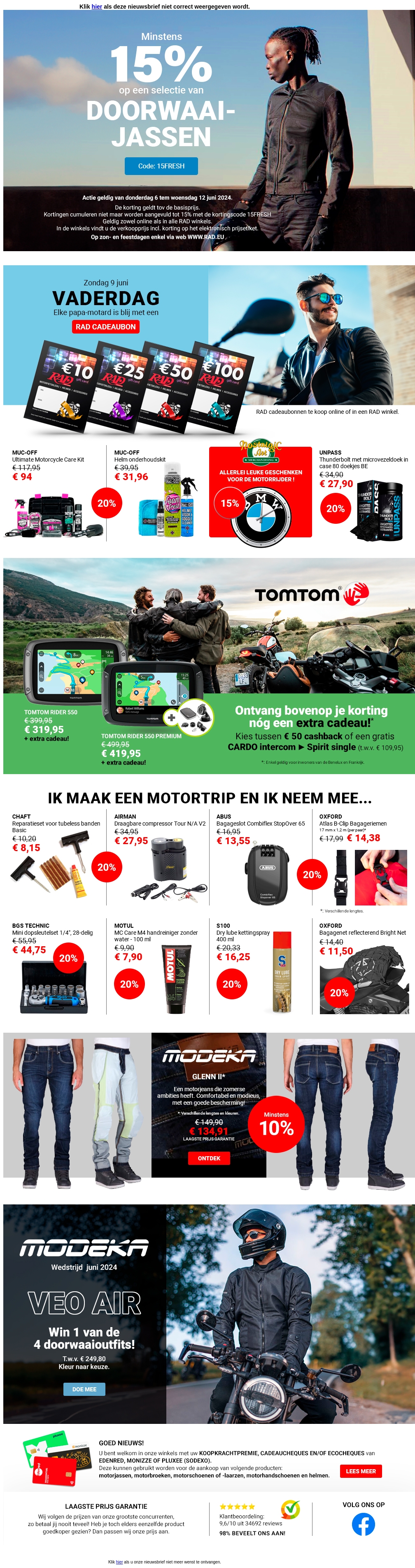 Ontvang nu minstens 15% korting op een selectie van doorwaaijassen. Gaat u op motortrip? Neem dan ook de Modeka Glenn jeansbroeken mee met minstens 10% korting. Mis ook andere geweldige aanbiedingen niet!
