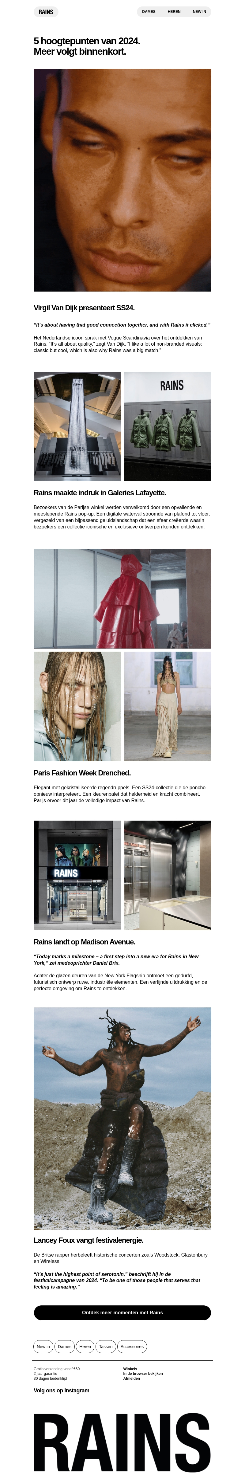 Rains presenteert de hoogtepunten van hun 2024 collectie. Met een indrukwekkende show op Paris Fashion Week en een nieuw filiaal in New York, laat Rains zijn innovatieve regenkleding zien. Ontdek de stijlvolle ontwerpen en exclusieve releases.