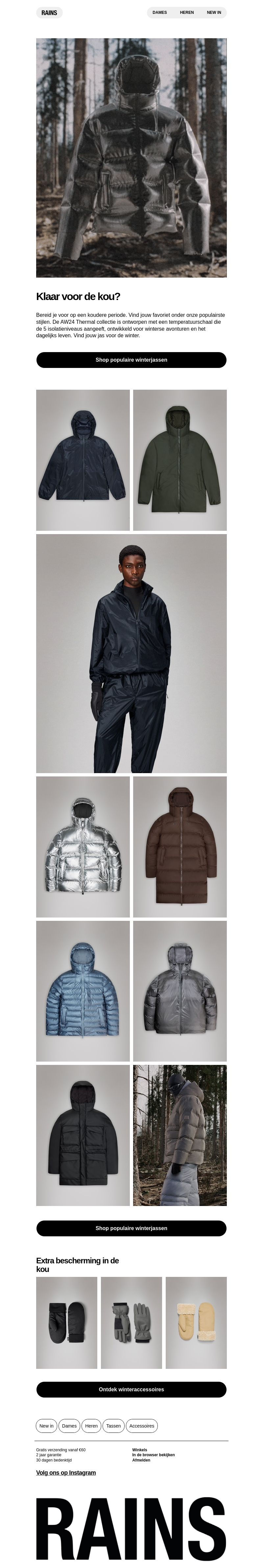 Bereid je voor op de kou met de nieuwste winterjassen van RAINS. Vind jouw favoriet onder de trendy ontwerpen die warmte en stijl combineren. Met een breed scala aan kleuren en maten vind je altijd een jas die perfect bij je past. Bekijk ook accessoires voor extra bescherming. Mis deze kans niet om stijlvol de winter door te komen.