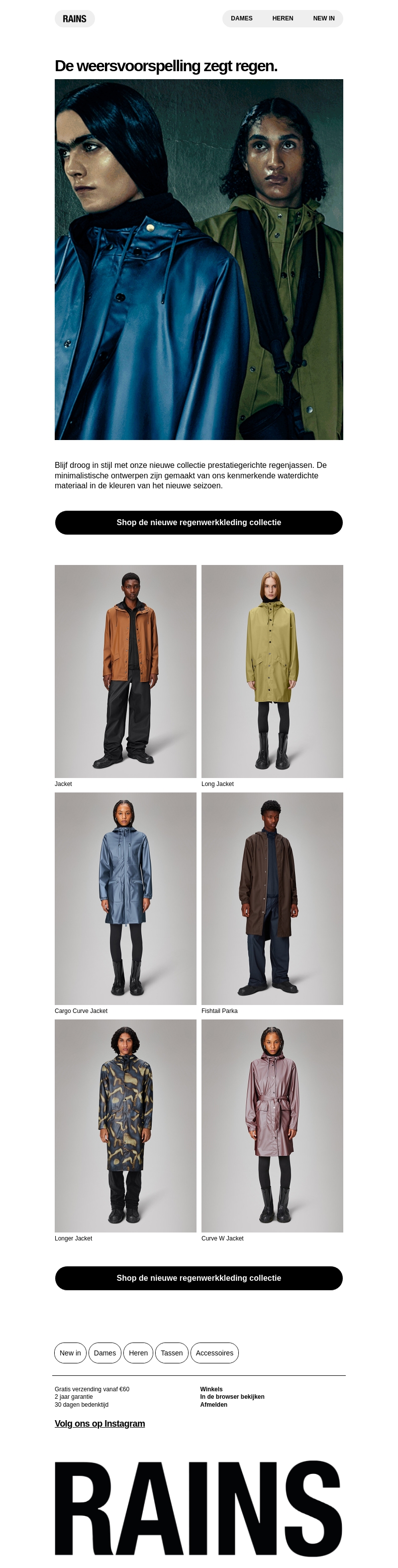 Blijf droog en stijlvol met onze nieuwe collectie prestatiegerichte regenjassen. De minimalistische ontwerpen zijn gemaakt van ons kenmerkende waterdichte materiaal in de kleuren van het nieuwe seizoen. Ontdek de nieuwste stijlen zoals de Longer Jacket en Fishtail Parka.