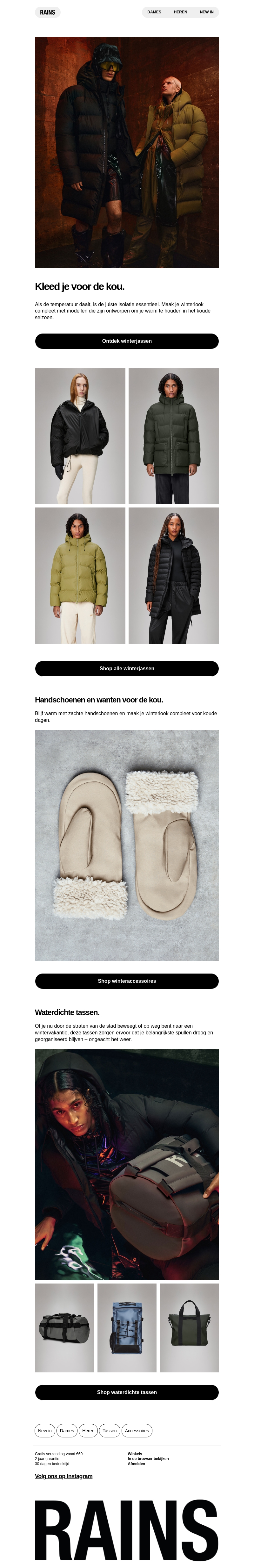 Kleed je tegen de kou met de nieuwe collectie van Rains. Ontdek onze stijlvolle winterjassen, warme wanten en praktische waterdichte tassen. Perfect voor koude dagen en avontuurlijke uitstapjes. Shop nu en bereid je voor op de winter met ons aanbod.