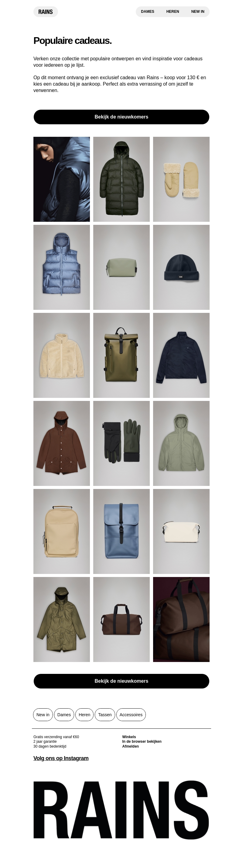 Verken de nieuwste collectie van Rains met populaire ontwerpen die perfect zijn als cadeau. Bij een aankoop vanaf €130 ontvang je een exclusief cadeau. Ideaal voor verrassingen of jezelf verwennen.