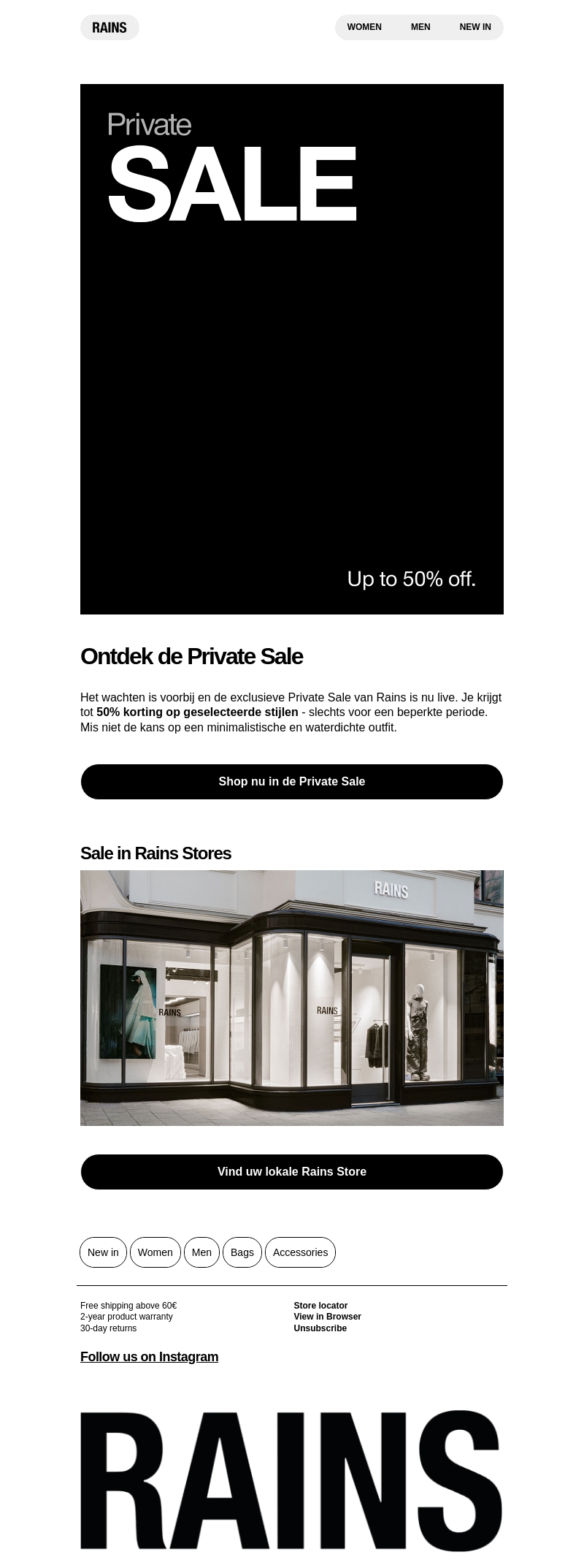 Het wachten is voorbij! De exclusieve Private Sale van Rains is nu live. Profiteer van kortingen tot 50% op geselecteerde stijlen. Mis deze kans niet om je minimalistische en waterdichte outfit aan te vullen. Bekijk het nu online of in een van onze winkels.