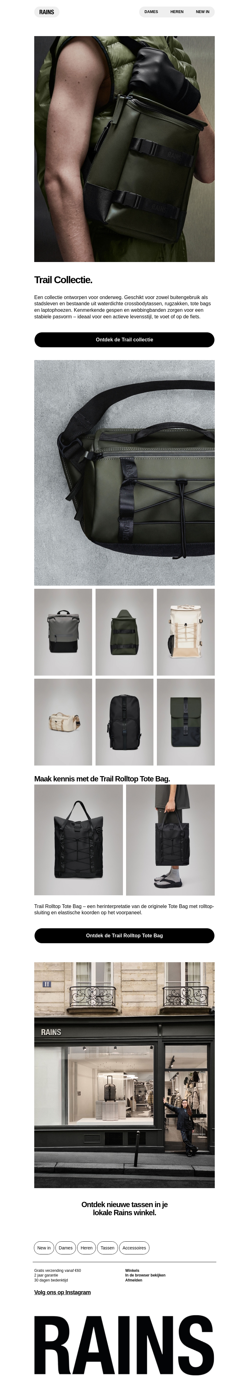 De Trail Collectie van RAINS is perfect voor outdoor avonturen, met stijlvolle en functionele tassen die passen bij elke gelegenheid. Maak kennis met de innovatieve Rolltop Tote Bag, die praktisch en trendy is. Bezoek je lokale RAINS-winkel om de nieuwste collectie te ontdekken.
