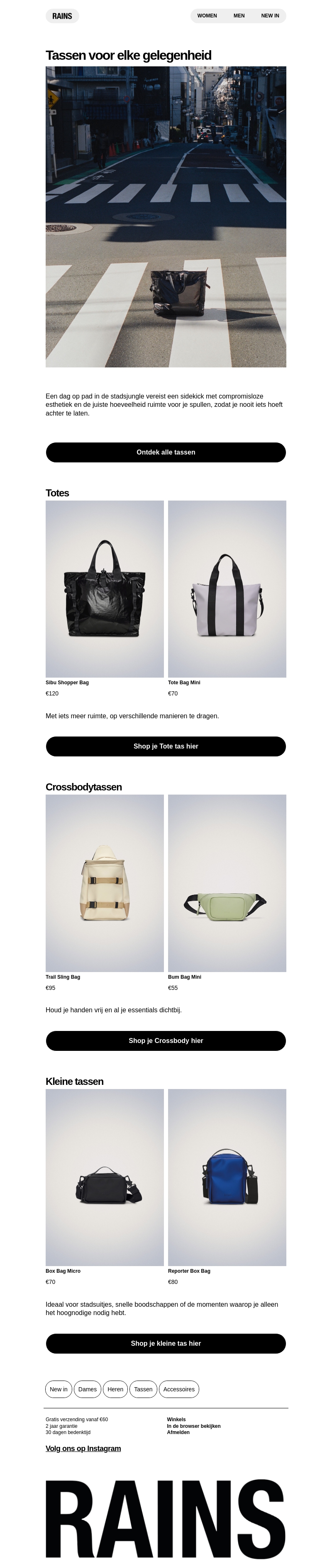 Verken de nieuwste collectie tassen van RAINS, ontworpen voor veelzijdigheid en stijl. Of je nu op zoek bent naar een tote, crossbody, of kleine tas, RAINS biedt een breed scala aan opties om aan al jouw reisbehoeften te voldoen. Shop nu en vind de perfecte tas die bij jouw levensstijl past.