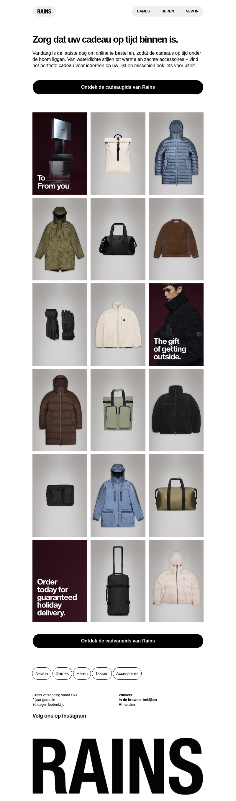 Vandaag is uw laatste kans om iets bijzonders te vinden bij Rains. Ontdek een ruime selectie aan waterdichte stijlen en zachte accessoires. Van warme jassen tot stijlvolle tassen, perfect voor iedereen op uw lijst. Zorg ervoor dat uw cadeau op tijd is met gegarandeerde levering. Bekijk nu de cadeaugids op onze website.